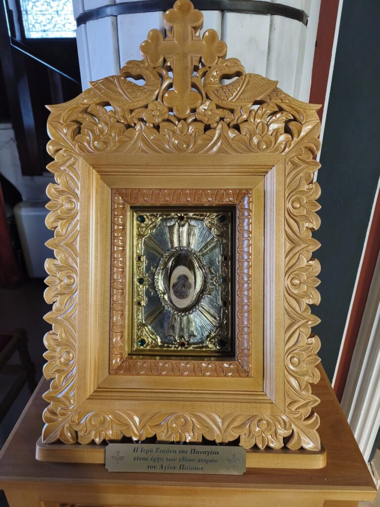 Στον Ιερό Ναό της Ευαγγελιστρίας Ναυπλίου φυλάσσεται πλέον ένα μικρό αλλά μεγάλου πνευματικού πλούτου εικονίδιο: η Παναγία που κρατά τον Χριστό, σκαλισμένη με τα ίδια τα χέρια του Αγίου Παϊσίου του Αγιορείτη.