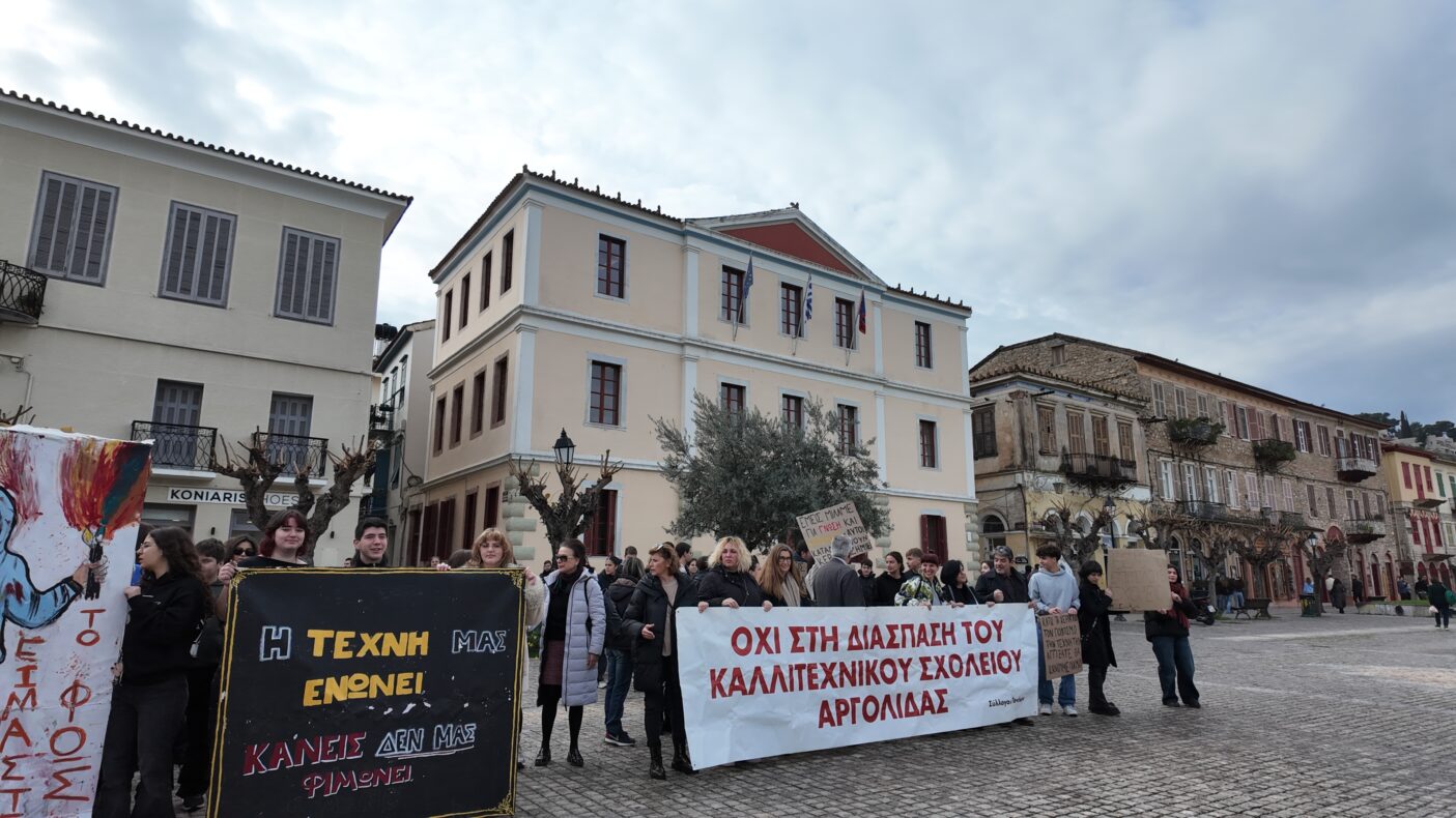 Το πρωί της Παρασκευής 23 Ιανουαρίου 2026, μαθητές του Καλλιτεχνικού και του Μουσικού Σχολείου Αργολίδας πραγματοποίησαν κοινή, ειρηνική διαμαρτυρία στην Πλατεία Τριών Ναυάρχων στο Ναύπλιο, στο πλαίσιο των πανελλαδικών δράσεων της Μουσικοκαλλιτεχνικής Ένωσης.