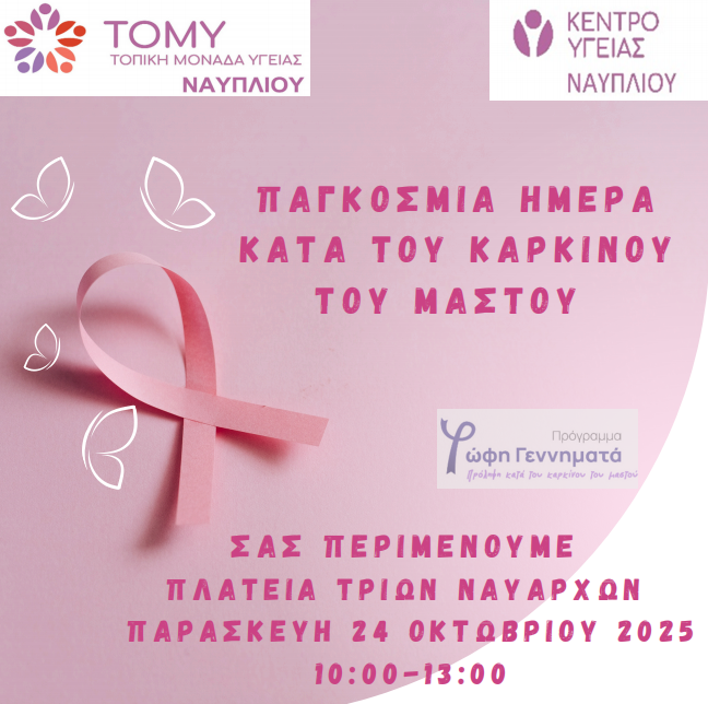 ΔΡΑΣΗ ΓΙΑ ΤΗΝ ΠΑΓΚΟΣΜΙΑ ΗΜΕΡΑ ΚΑΤΑ ΤΟΥ ΚΑΡΚΙΝΟΥ ΤΟΥ ΜΑΣΤΟΥ- ΠΑΡΑΣΚΕΥΗ 24 ΟΚΤΩΒΡΙΟΥ- ΤΟΜΥ ΝΑΥΠΛΙΟΥ