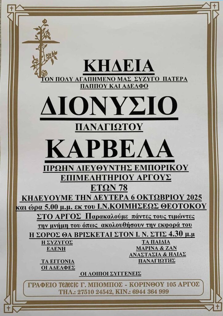 Βαθιά θλίψη έχει προκαλέσει στην κοινωνία του Άργους και ολόκληρης της Αργολίδας η είδηση του θανάτου του Διονύση Καρβέλα, σε ηλικία 78 ετών.