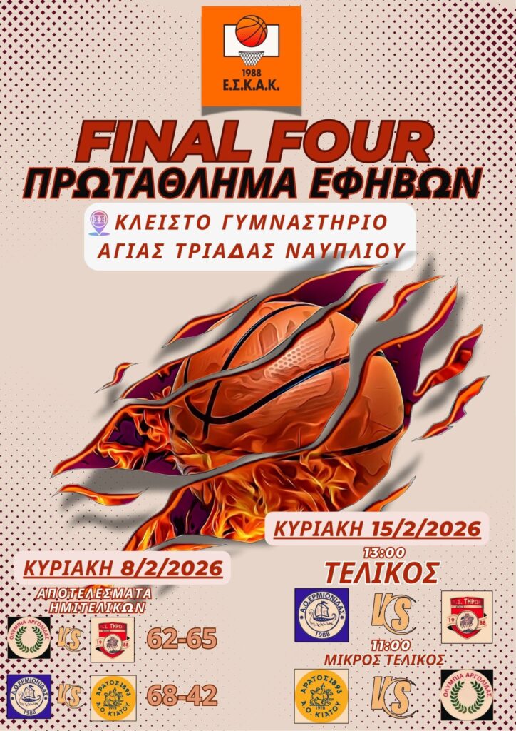 Έτσι, ΑΟ Ερμιονίδας και ΑΣ Τήρων θα αγωνιστούν στον μεγάλο τελικό την Κυριακή 15/2/2026 και ώρα 13:00 στο ίδιο γήπεδο (κλειστό γυμναστήριο της Αγίας Τριάδας). ΑΜΣ Ολύμπια Αργολίδας και Άρατος 1893 ΑΟ Κιάτου θα παίξουν στον μικρό τελικό, την ίδια ημέρα ώρα 11:00 στο ίδιο γήπεδο.