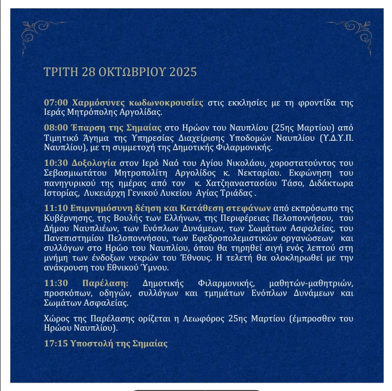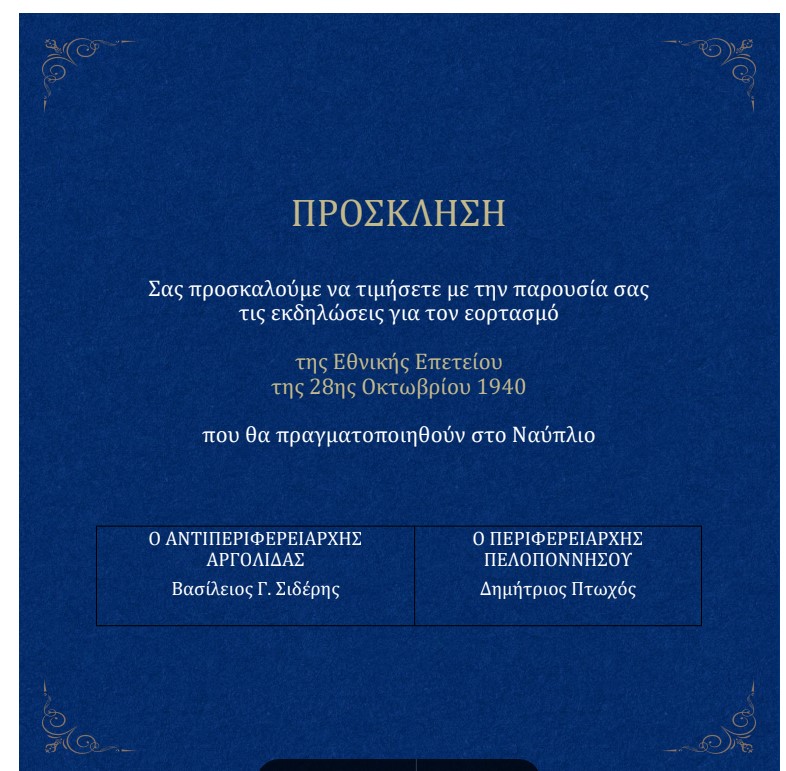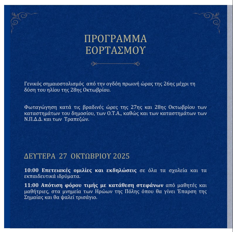 Οκτωβρίου 1940, σας διαβιβάζουμε το πρόγραμμα εκδηλώσεων που θα λάβουν χώρα στην έδρα της